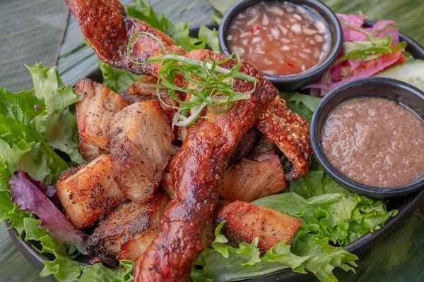 Crispy, golden-brown roasted pork belly with tender, flavorful meat and dip of vinegar sauce.