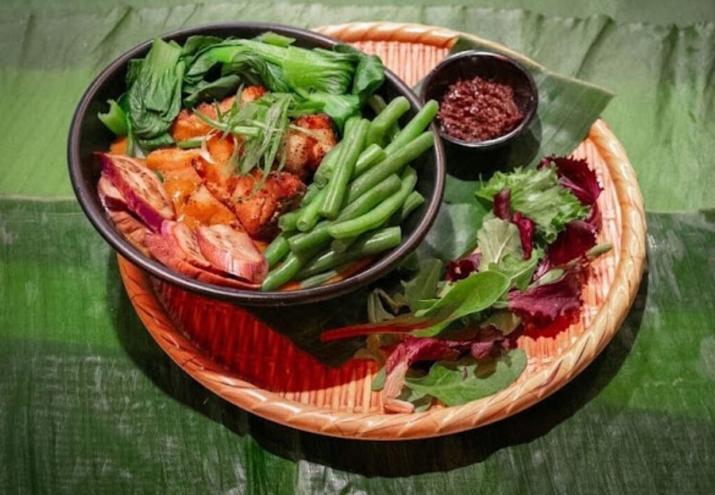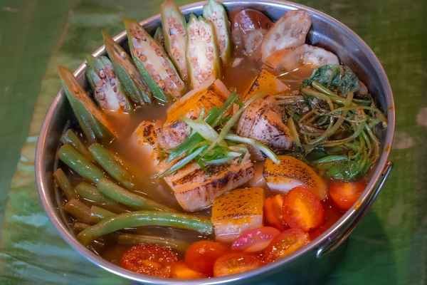 A tangy and savory broth made with pork, tamarind, tomatoes, and a medley of fresh vegetables.