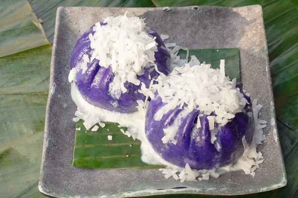 Purple pillowy steamed buns filled with Ube halaya jam topped with salted coconut cream and coconut flakes.