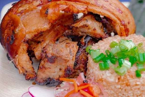 Slow-roasted rolled pork belly. (11-12 lbs). Served with a Tray of Rice and Lechon Sauce.