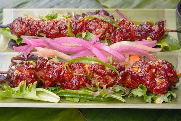 Pork bbq marinated in spicy banana ketchup, soy sauce, and annatto. 32 pieces.