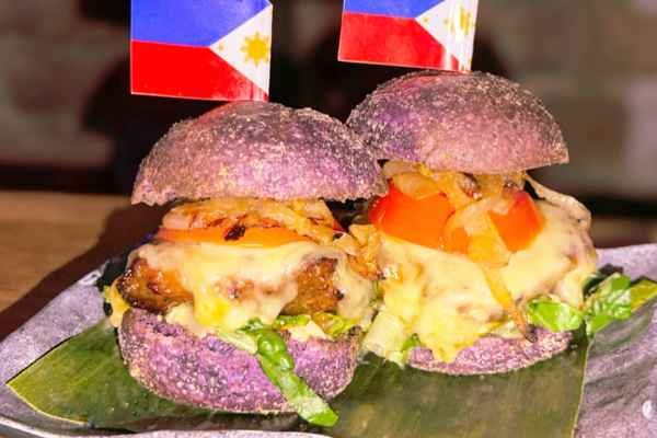 Seared beef tapa in an Ube bun with pickled papaya, onions, pineapple, peppers, and radish. 27 pieces.